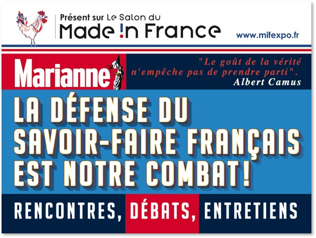 Marianne est partenaire du Salon Made In France, du 10 au 13 novembre à Paris. À cette occasion, nous vous proposons de communiquer dans le numéro spécial Made In France, distribué lors du salon.
